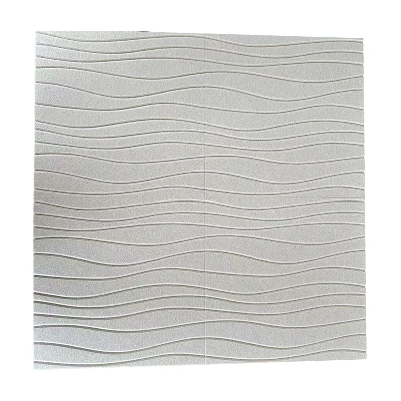 2. Højeffektiv lydabsorption: Den centrale "nålestansning"-proces er vores tekniske hemmelighed. Mikroporematrixen dannet af tusindvis af nålestik gør det muligt for Beige Wave PET Felt akustisk panel at opnå en lydabsorptionskoefficient på over 0,8 ved specifikke frekvenser (med et lufthulrum). Brug af det kan reducere indendørs efterklangstiden betydeligt, hvilket gør talen klarere, musikken renere og miljøet mere stille. 3. Miljøvenlig: Vores Beige Wave PET Filt akustiske panel indeholder over 50 % genanvendte polyesterfibre, og selve produktet kan genanvendes ved slutningen af dets livscyklus.