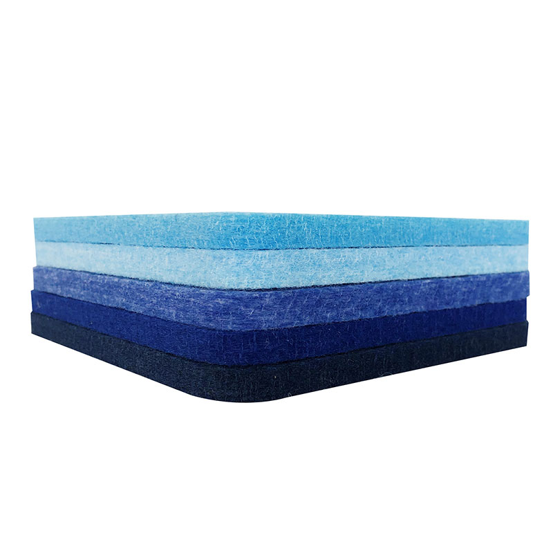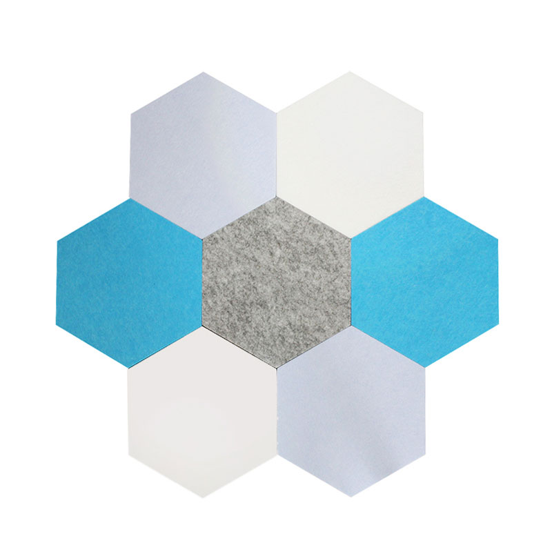 PET Hexagon akustisk panel er lavet af 100% polyester ved nålestansning. Produktionsprocessen er fuldstændig fysisk & miljøvenlig, ingen spildevand, emissioner, affald,. ingen klæbemiddel, den porøse karakter af akustisk panel gør det lydabsorberende og termisk isolerende med egenskaber af ikke-toksisk, ikke-allergifremkaldende, ikke-irriterende og indeholder ikke formaldehyd-bindemidler og har høj NRC: 0,85